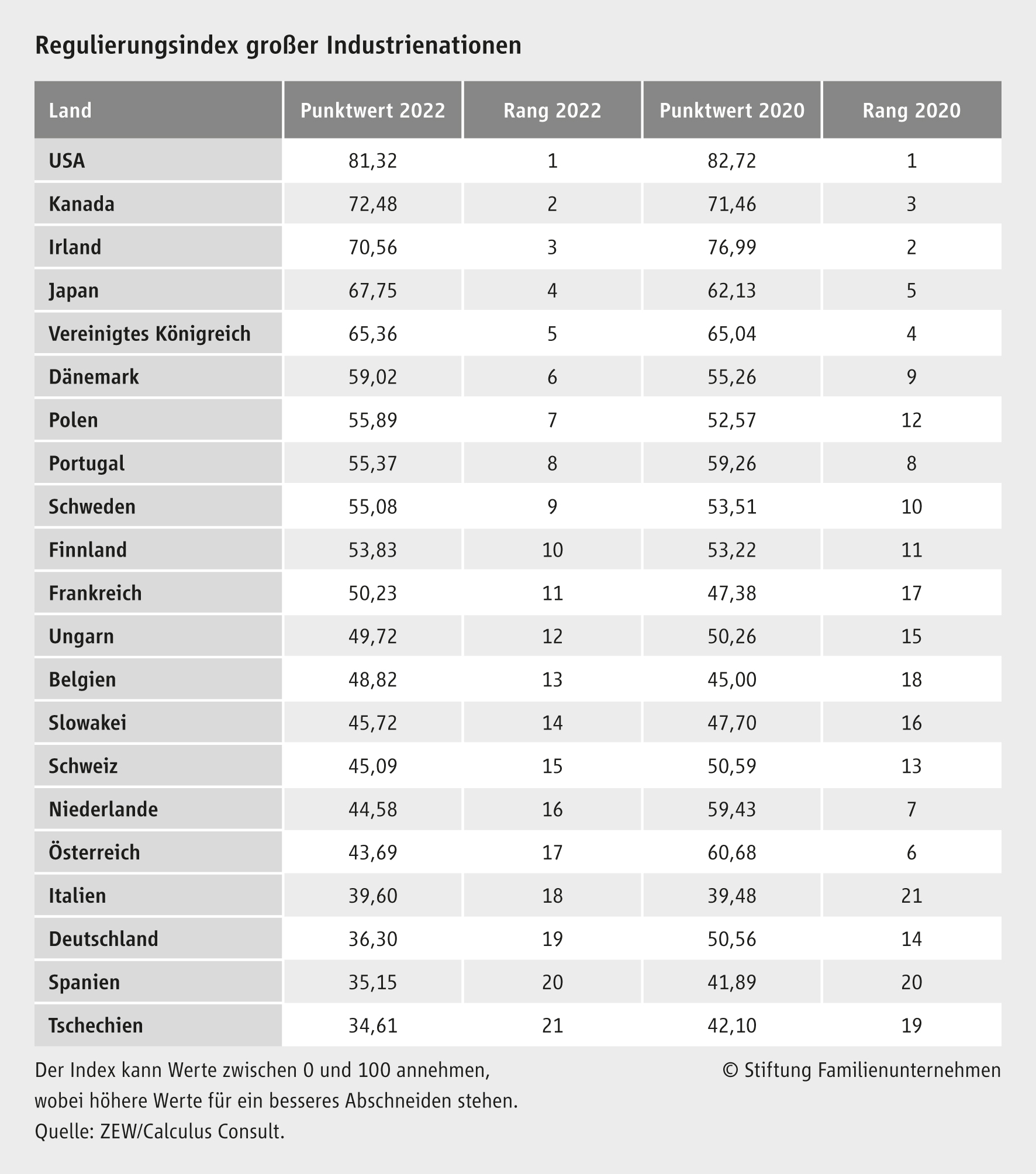 Der Subindex Regulierung wiederum setzt sich aus fünf gleich gewichteten Teilindikatoren zusammen: Arbeitsmarkt und Tarifrecht, Außenhandel, Geschäftsgründung, Regulierungen im laufenden Geschäftsbetrieb und Betriebliche Mitbestimmung.