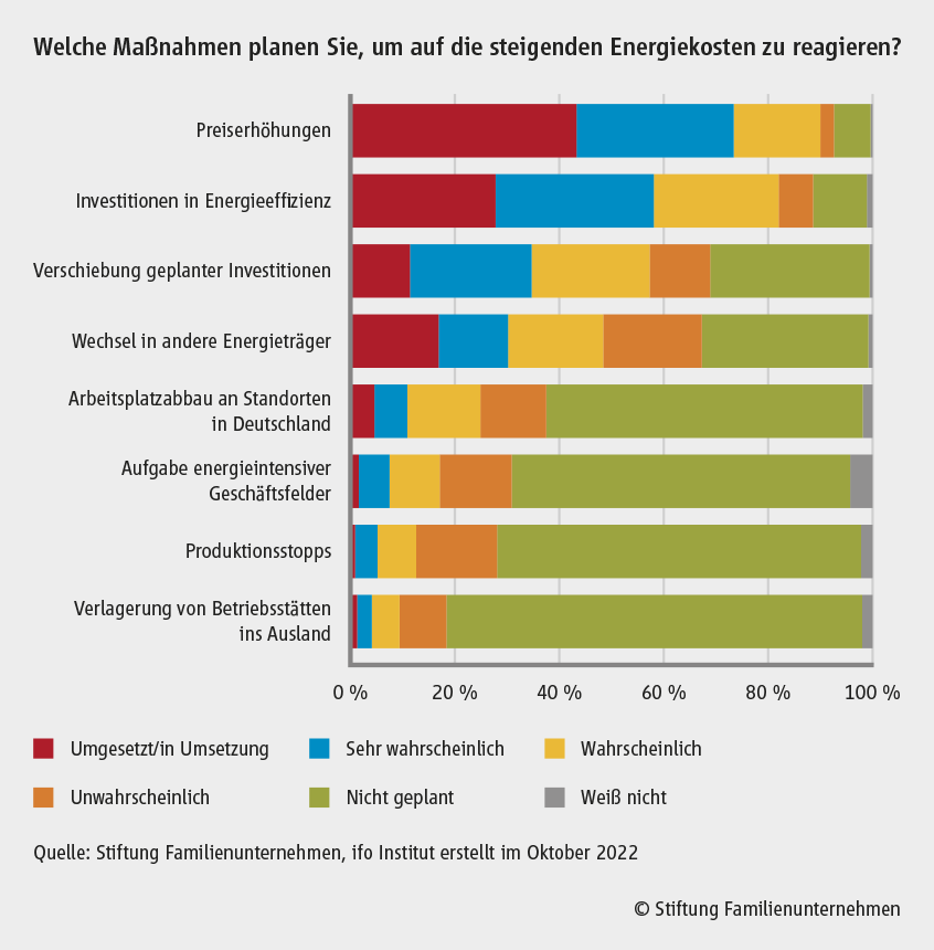 Aus der Umfrage geht außerdem hervor, dass 90 Prozent der Unternehmen wahrscheinlich die Preise erhöhen werden oder Preiserhöhungen schon durchgesetzt haben. Bei 25 Prozent der befragten Unternehmen ist der Abbau von Arbeitsplätzen eine Maßnahme, um den steigenden Preisen für Strom und Gas zu begegnen.