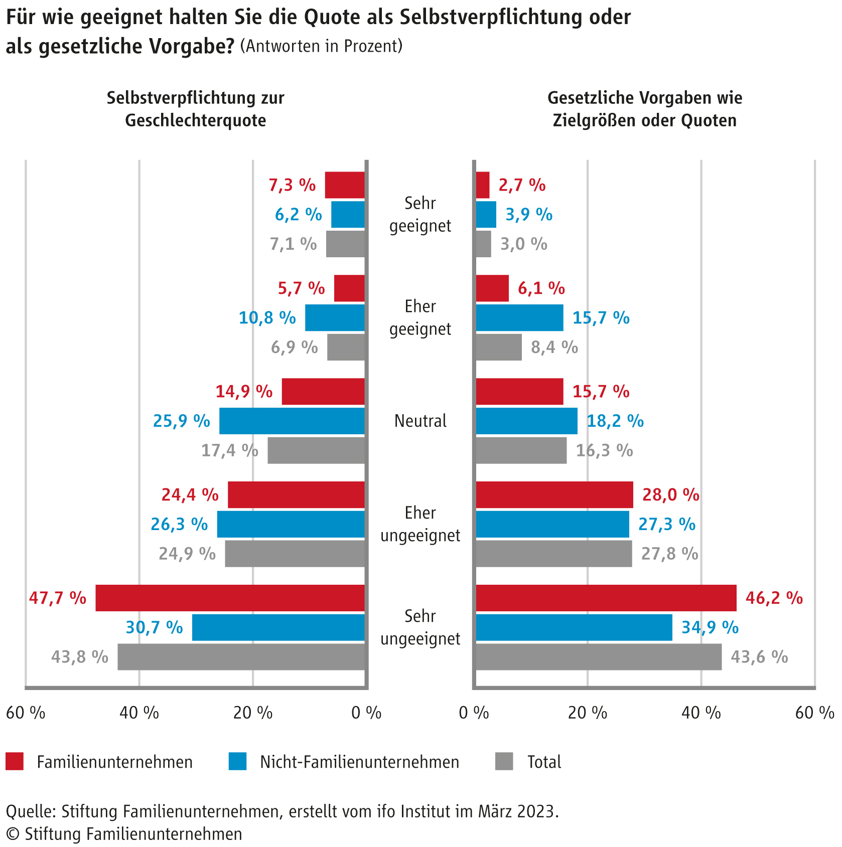 Only a third of all companies surveyed have the stated goal of increasing the percentage of women in management positions. The position against fixed quotas is clear, both in the form of a voluntary commitment (69 per cent) and in the form of legislation (71 per cent), particularly among family businesses (72 and 74 per cent). “This type of company attaches great importance to agility and considers it a disadvantage if fixed specifications restrict the search for skilled workers for the restructuring of the economy”, says Professor Kirchdörfer.